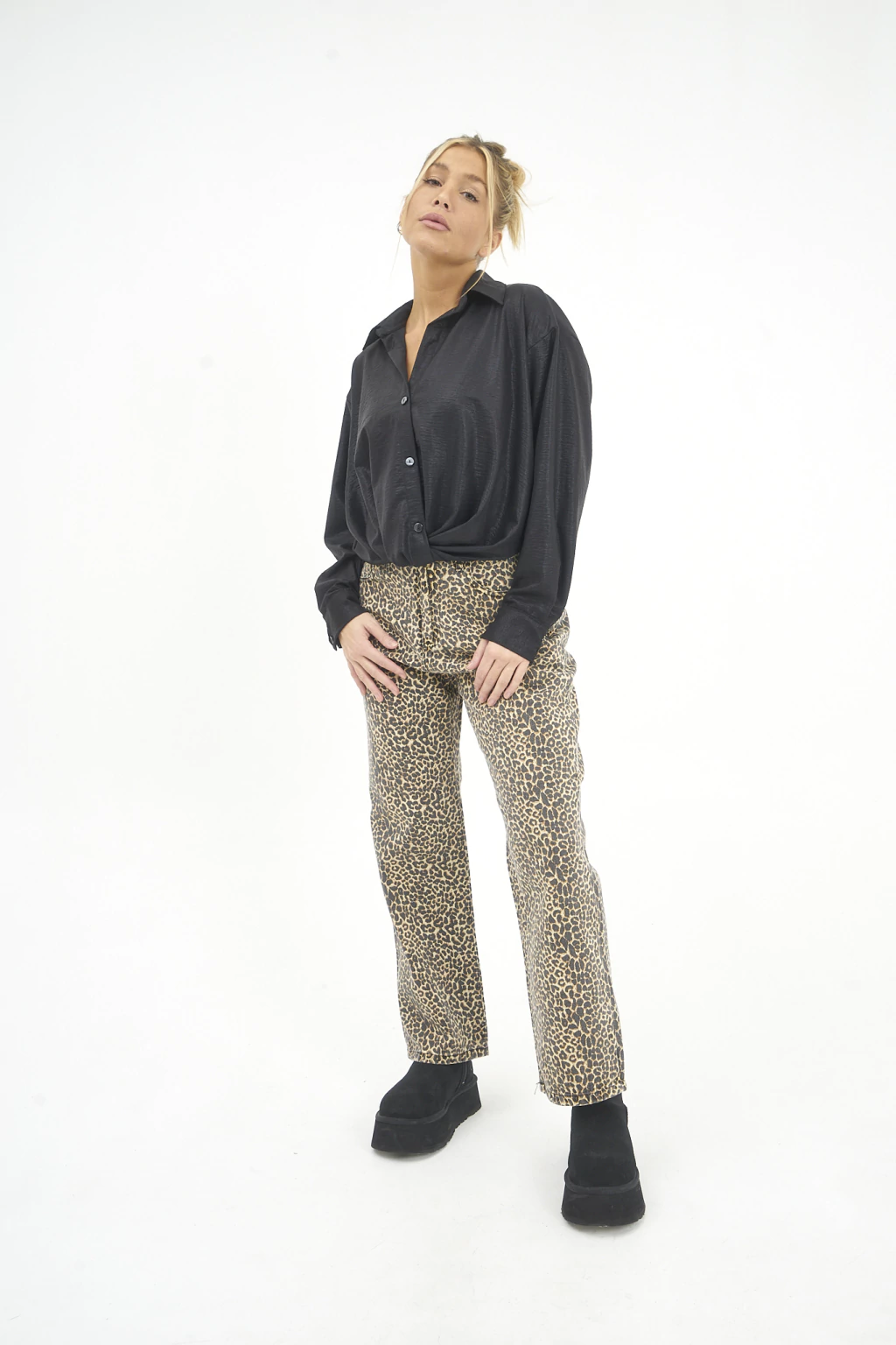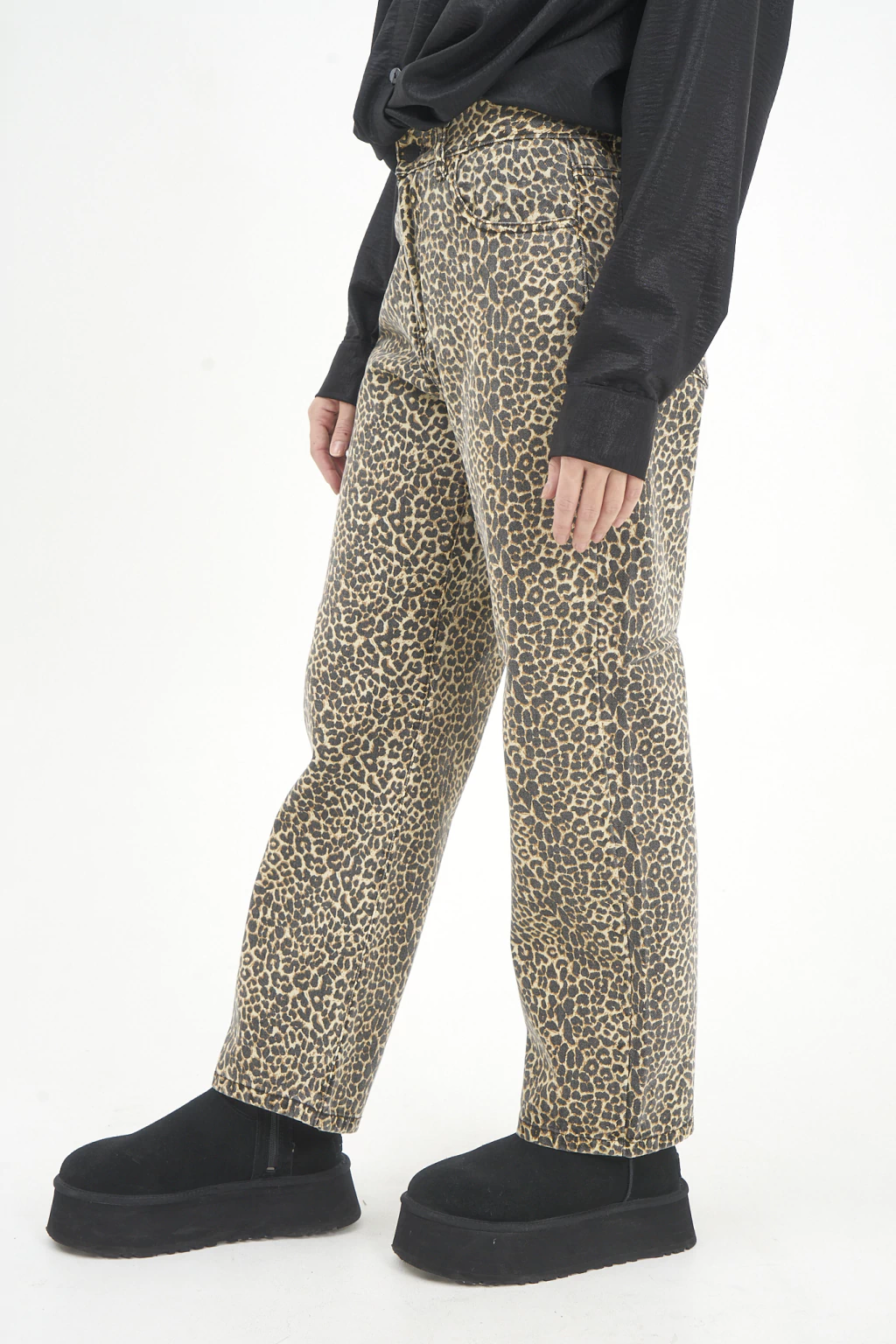 Pantalón rígido tiro medio corte recto animal print gastado encimático.