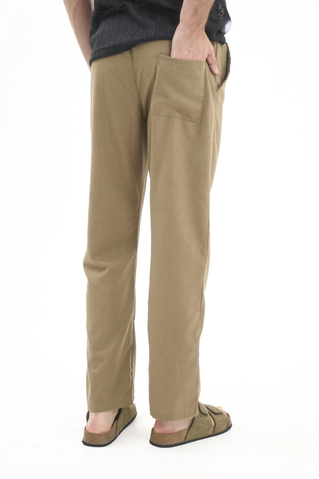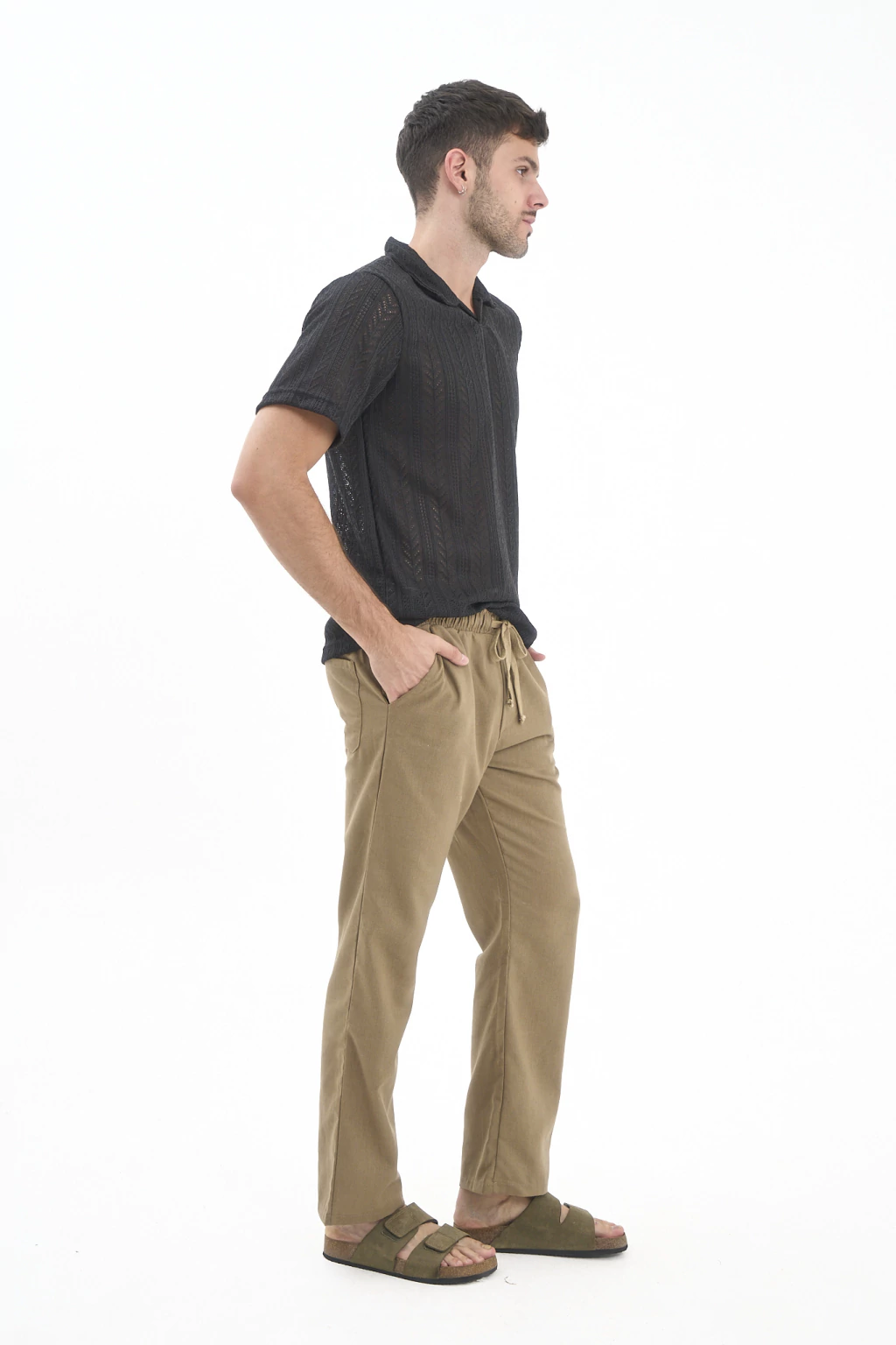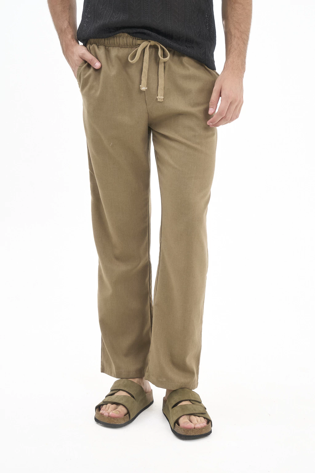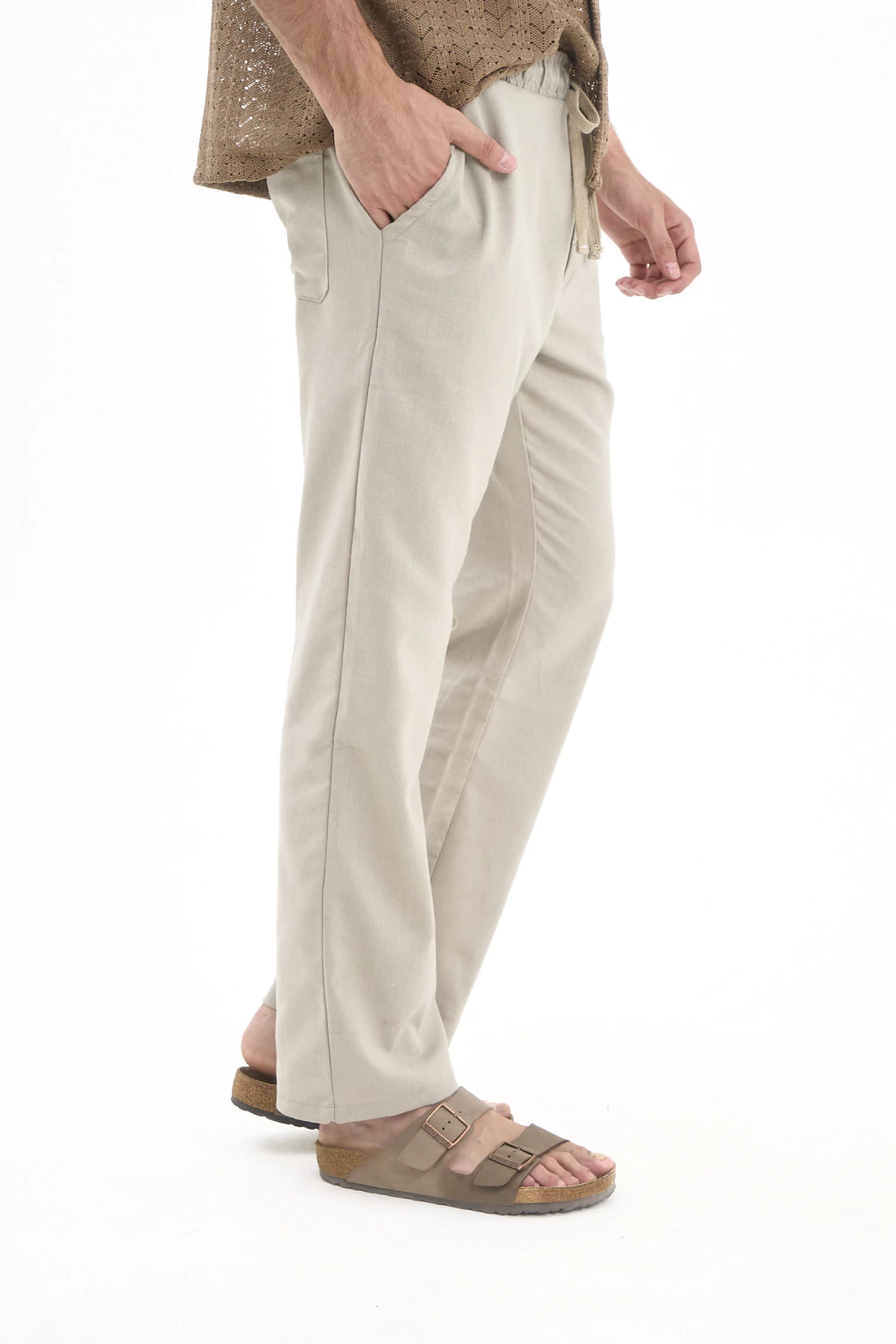 Pantalón recto de lino con elástico y cordones para ajustar.