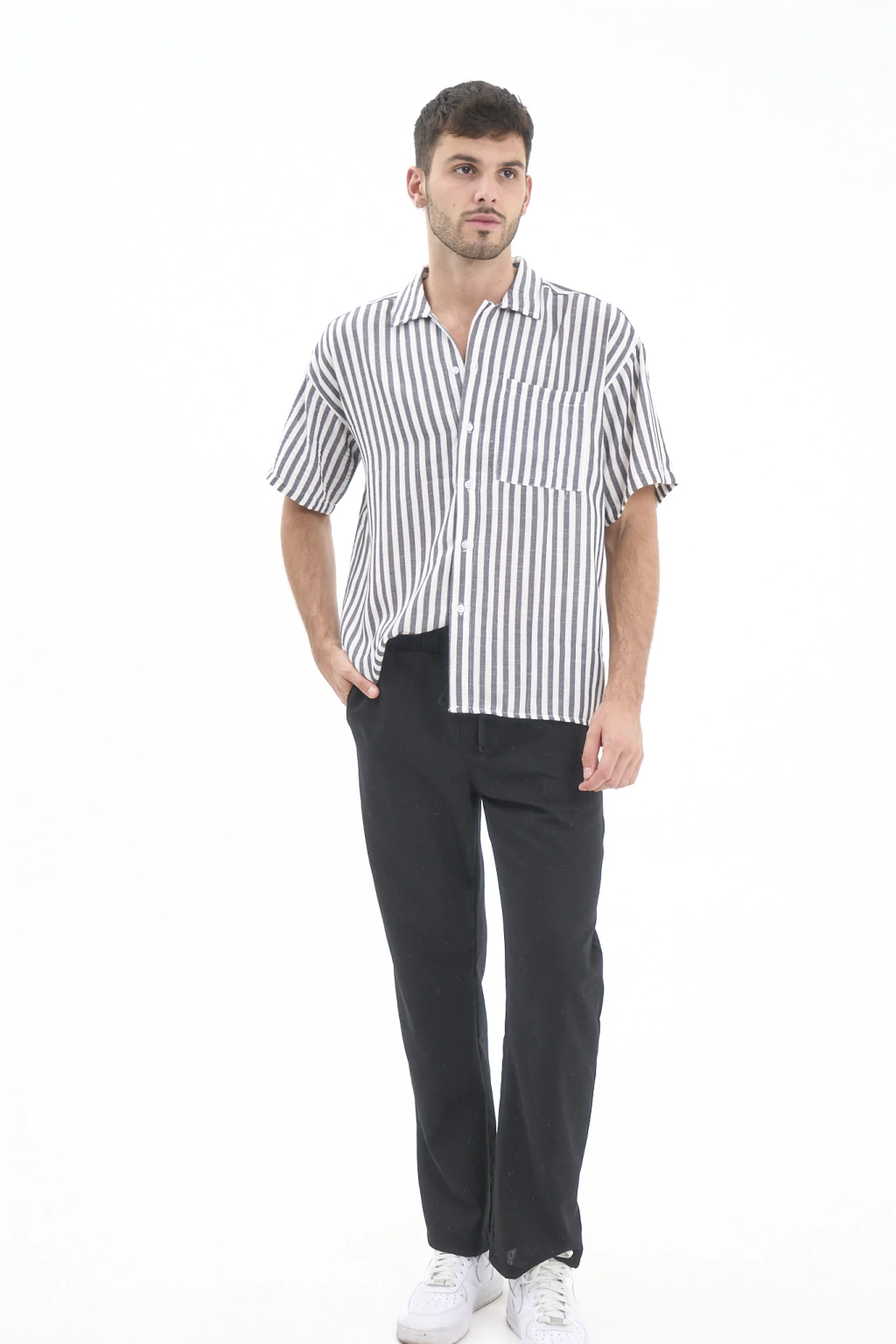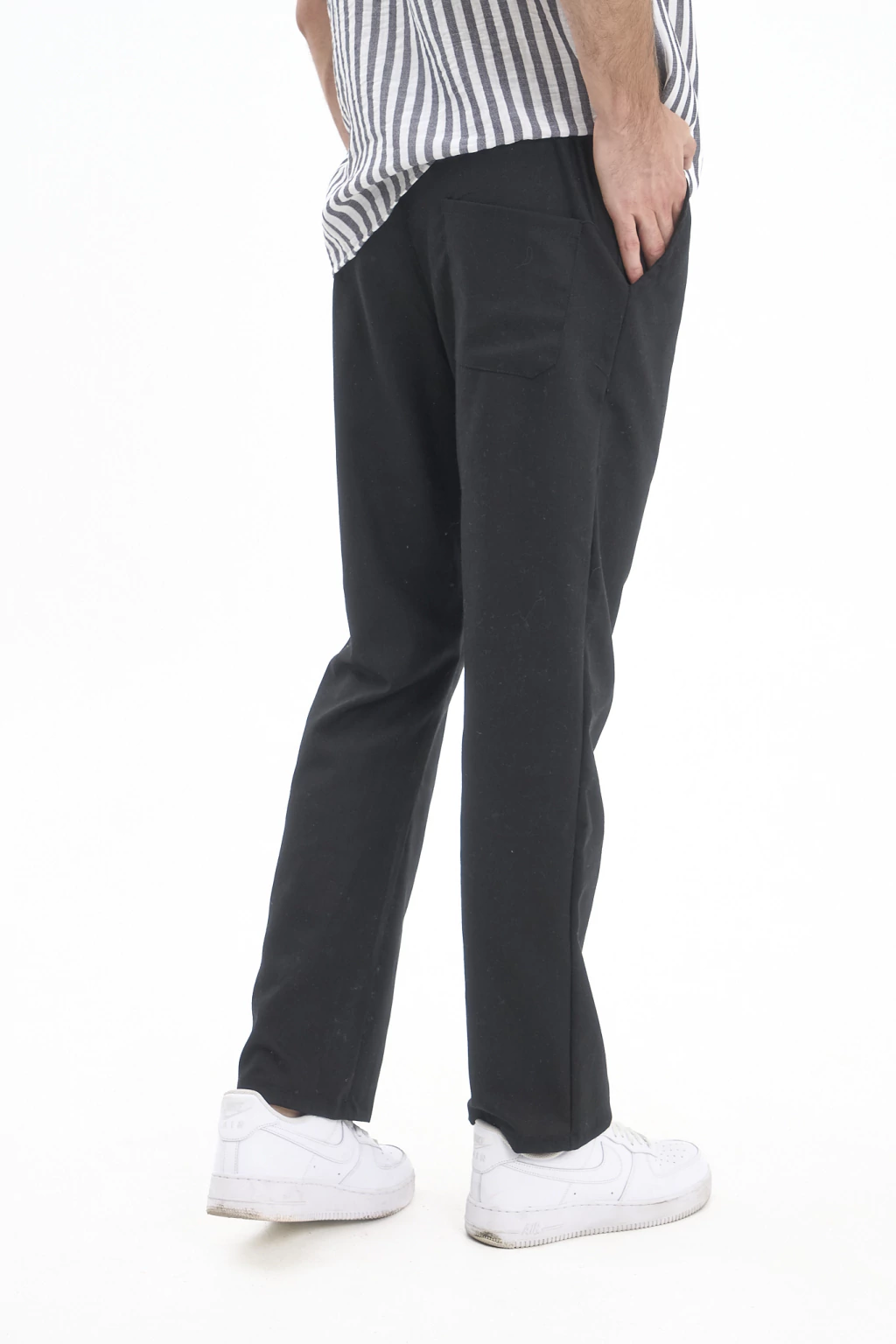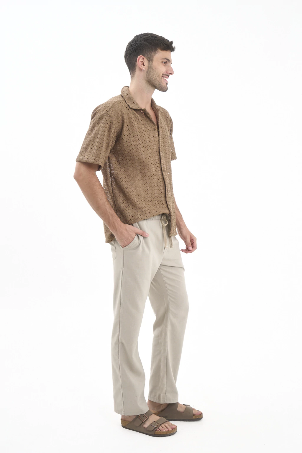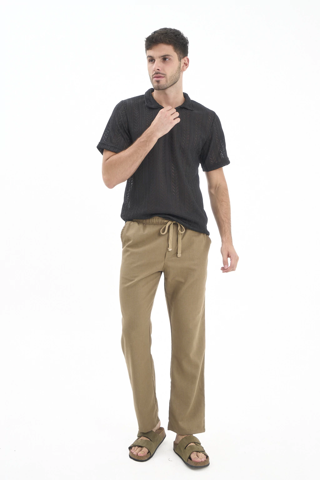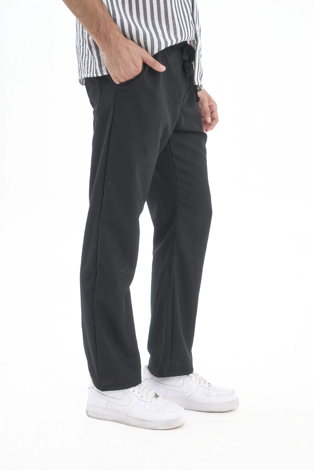 Pantalón recto de lino con elástico y cordones para ajustar.