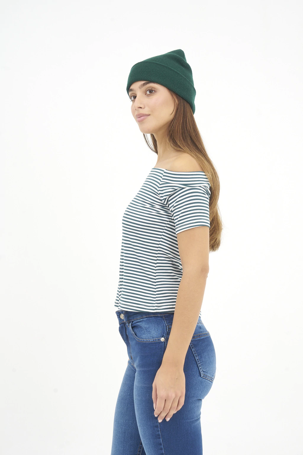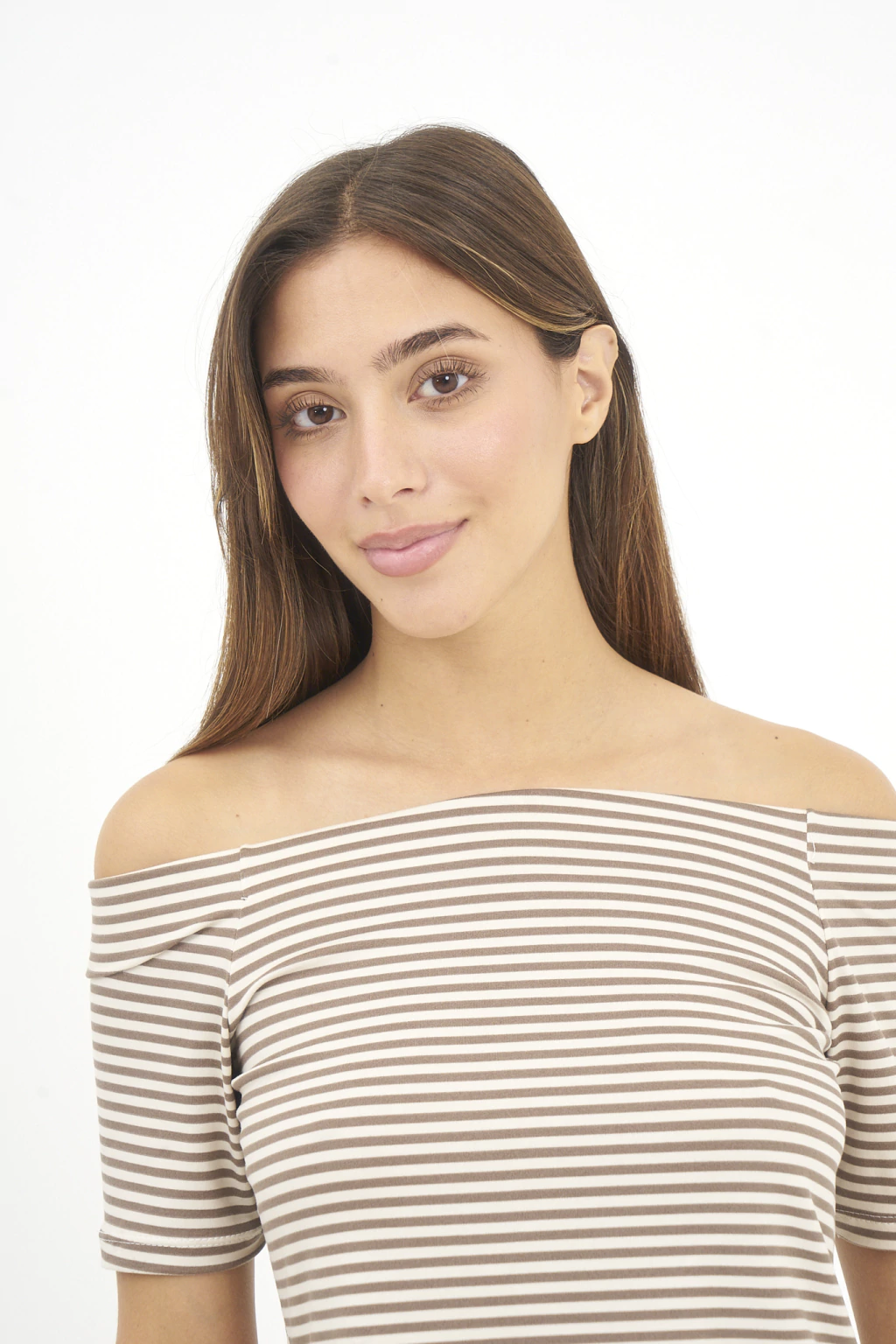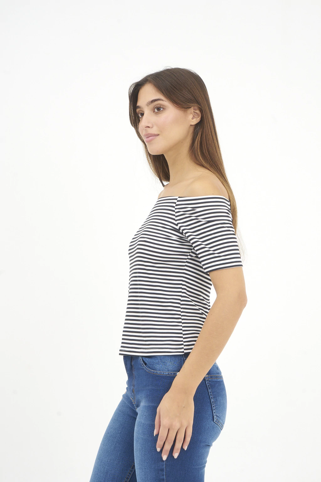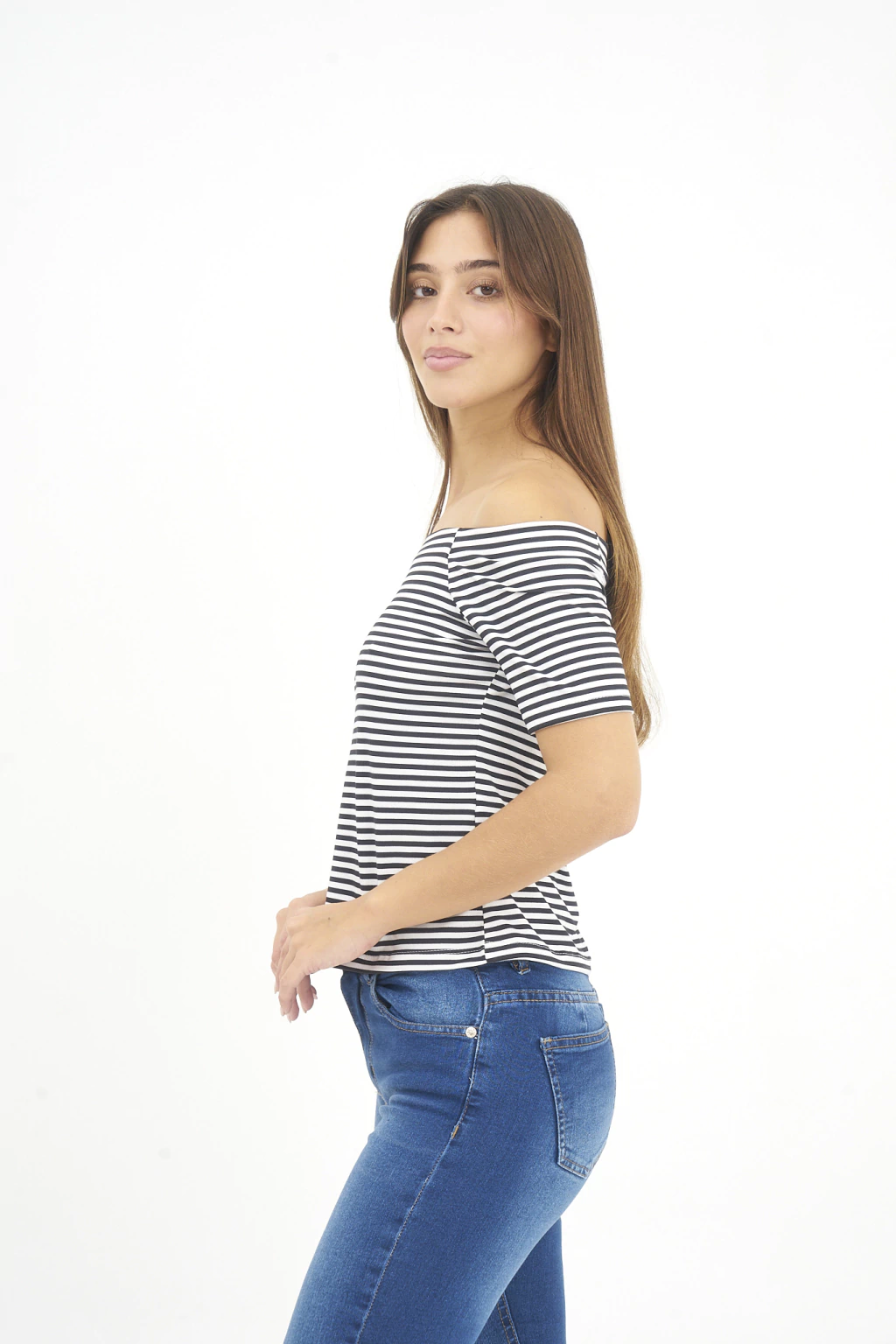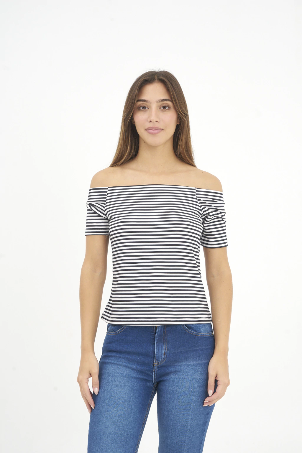 Remera cuello bote de modal gamuzado rayado manga corta.